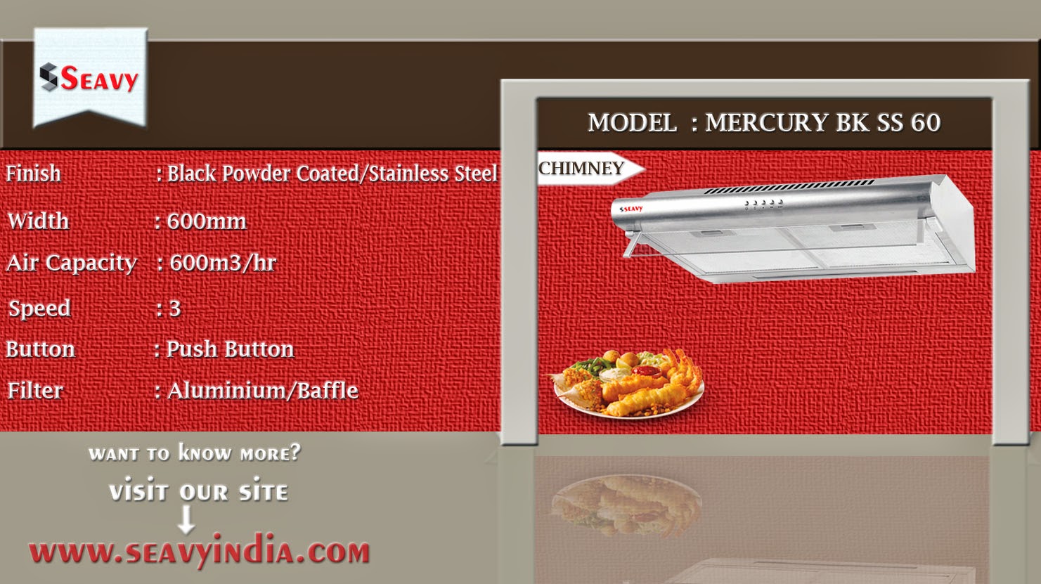 So many brands of electric kitchen chimney are available in market but seavy kitchen appliances brands are best and affordable price range in india. All these seavy products are easily available in Indian market also seavyindia website. Many models and sizes of electric kitchen chimney are also available to choose from as per the kitchen design with the stainless steel finish and glass finish bodies that add a touch of life style and value to your kitchen. The range of seavy kitchen chimney starts from Rs. 5000 and depend on your budget and choice.
